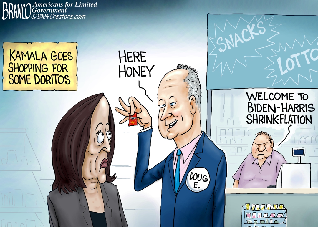 A.F. Branco Cartoon: Kamala seems unaware that she is the cause of the very problems she’s promising to fix. Has she witnessed the shrinkflation that everyday Americans are experiencing today?